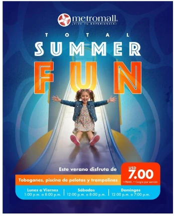Con un acceso inclusivo desde USD 7.00 + ITBMS + cargos por servicios, Total Summer Fun Metromall democratiza la diversión premium. Nuestros horarios facilitan su integración perfecta: