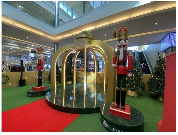 El corazón de esta experiencia late en los decorados temáticos repartidos por todo el mall. Empieza por la entrada principal, donde un gigantesco Cascanueces te saluda con su espada lista para batallar al Rey Ratoncito.